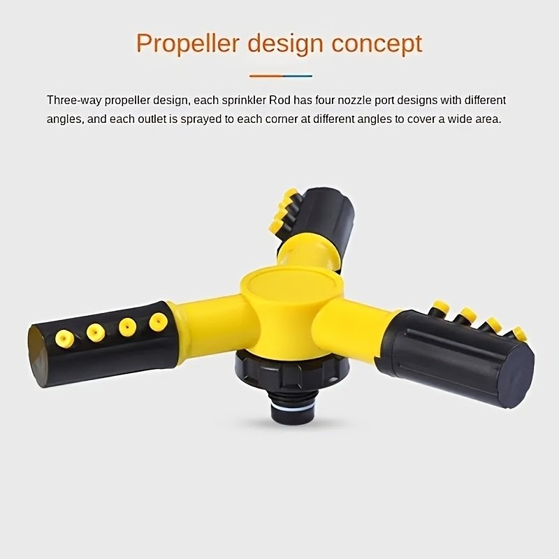 Product features1. Plastic trigeminal garden sprinkler: With streamlined base2.360 ° automatic rotation; spraying diameter is about 5~10m.3. Portable water inlet. It can be connected with European connector or American connector.