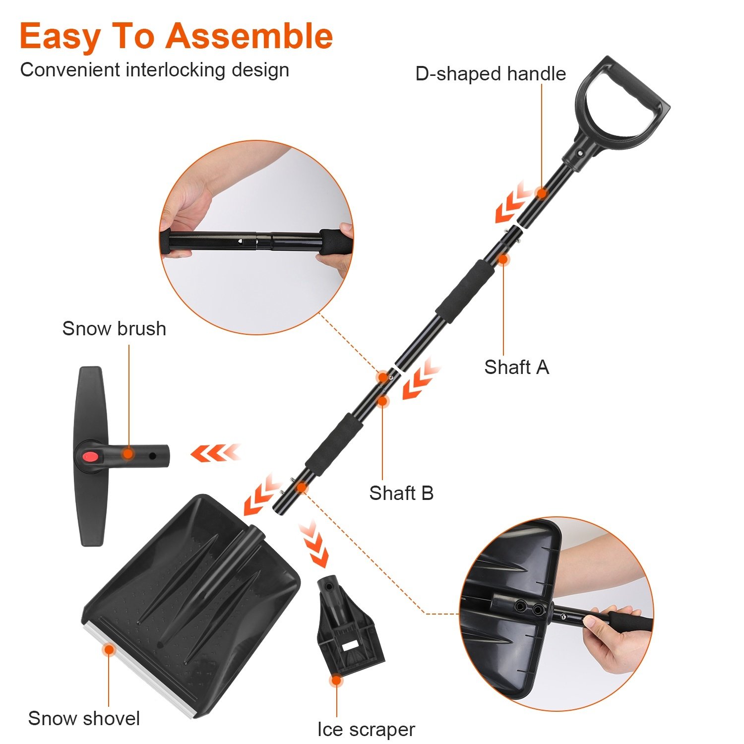 *Collapsible Design*:This snow clearing kit can be easily detached into 4 pieces for easier storage. Each component can be swapped effortlessly due to the interlocking design. That means you can freely adjust the length by adding or removing 1 shaft and switch the head.