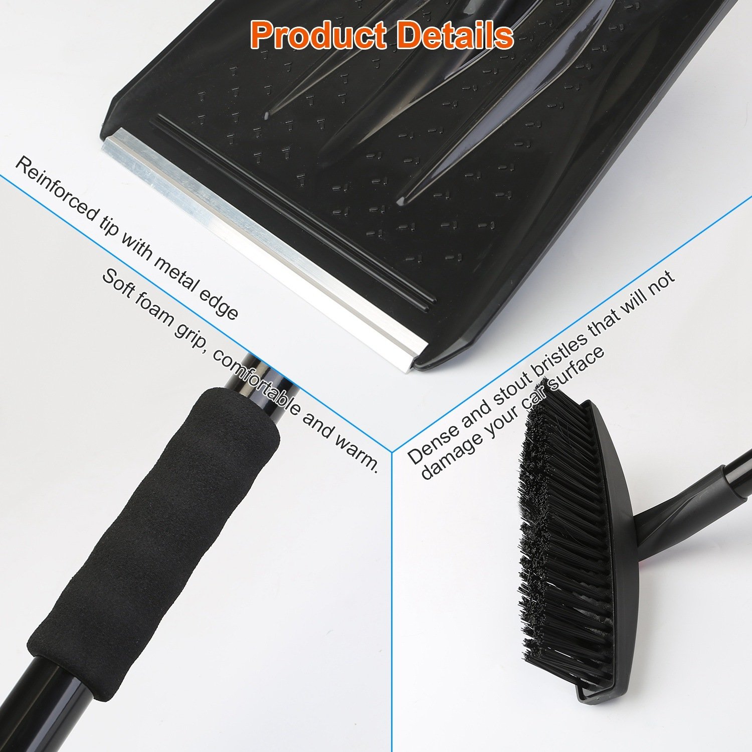 *3 IN 1 Multifunctional Snow Clearing Kit*:This snow clearing kit is equipped with a multi-functional 3-in-1 use where the shovel can be utilized as a snow shovel; ice scrape; and snow brush. The brush can be used to sweep snow while the scraper can scrape ice or frost. The large snow shovel is sturdy enough to remove heavy snow from your backyard or roadside.