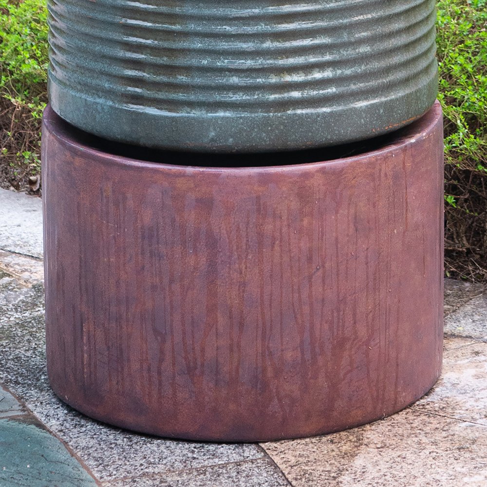 This two-tone water fountain is a contemporary outdoor decoration with a ribbed green body on a rustic brown base.Its durable cement construction and simple pillar shape make it ideal for a lawn or garden.Use this transitional fountain to upgrade your patio with the relaxing sounds of running water.