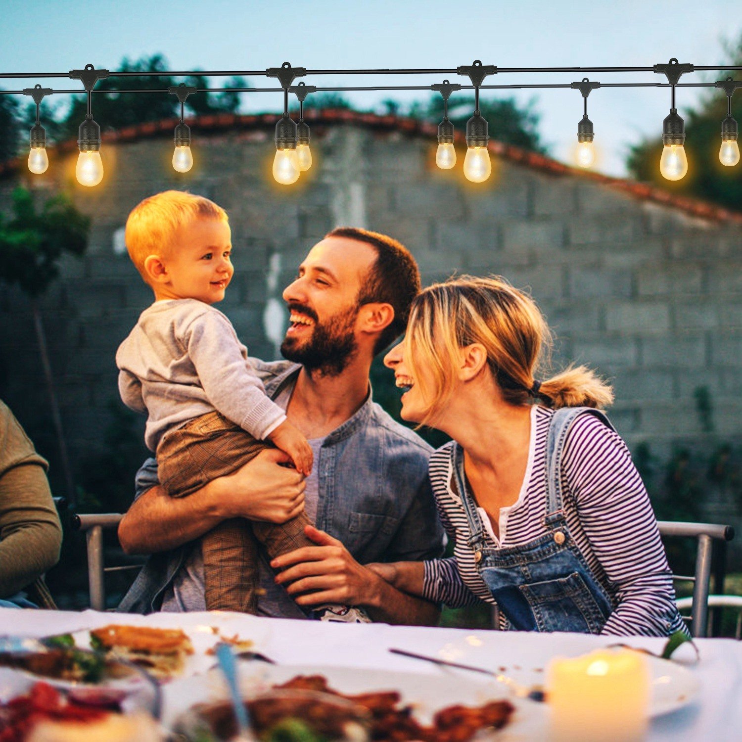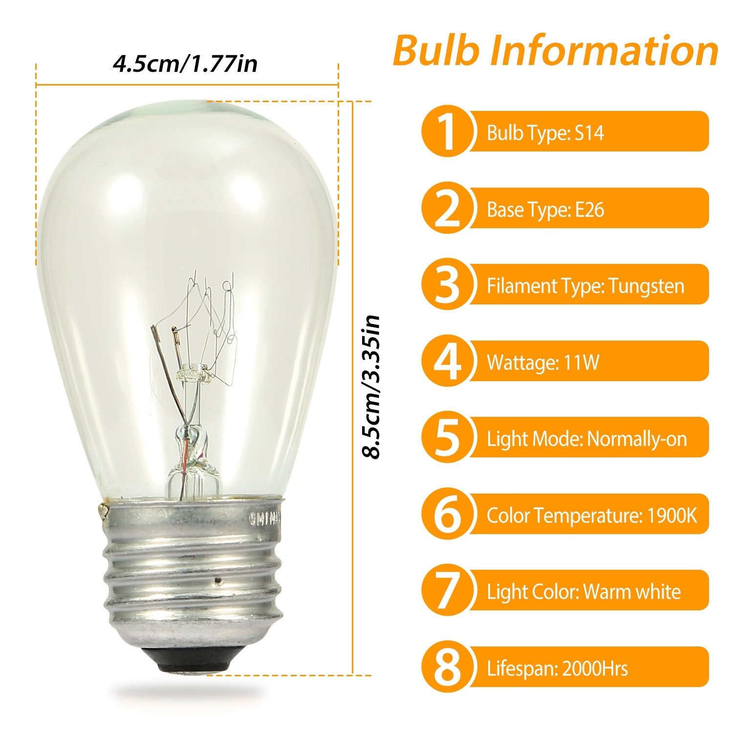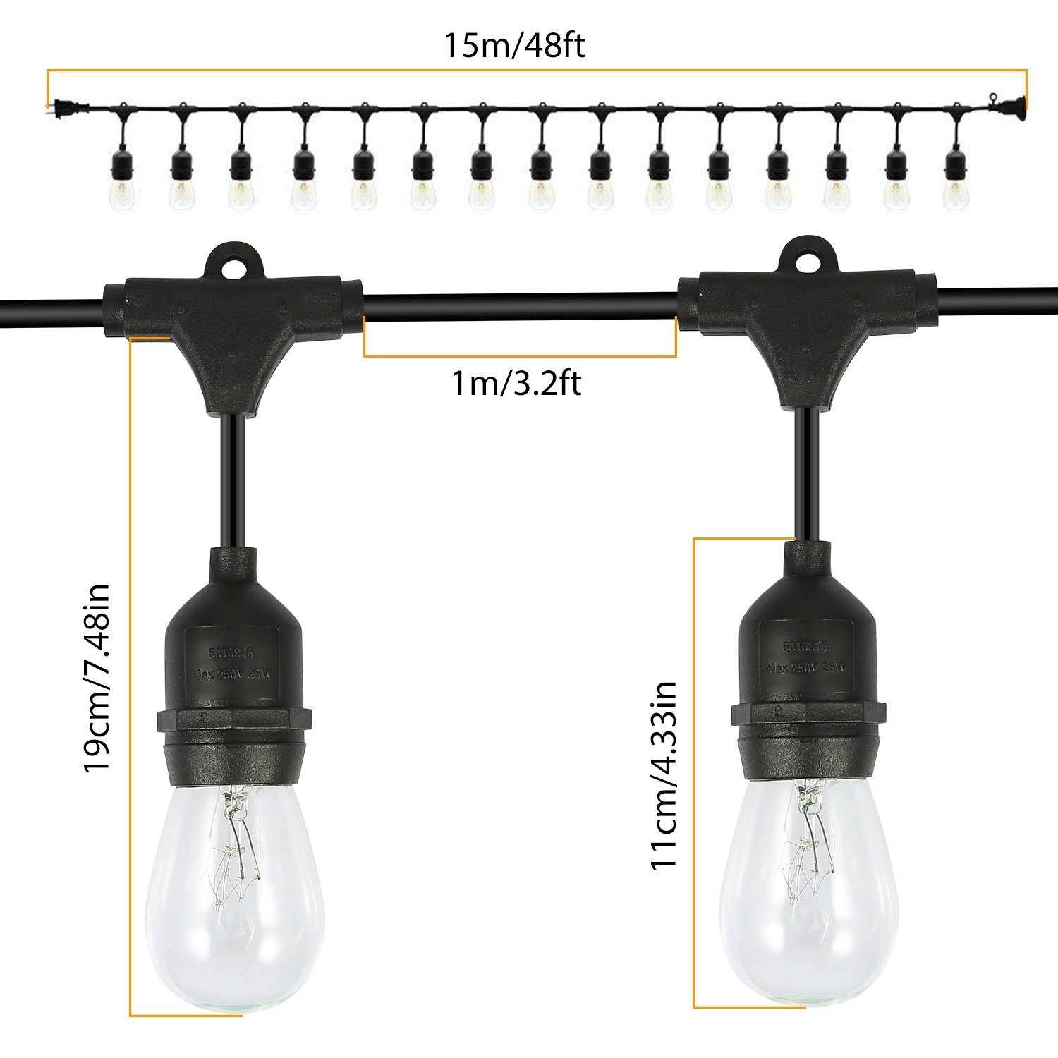 **EXCELLENT ATMOSPHERE DECORATION LIGHT*:15Pcs 11W 1900K warm white glass Tungsten filament bulbs are strung through a 48ft long cord to create a warm,cozy and relaxing atmosphere. Perfect for gathering and a romantic dinner.