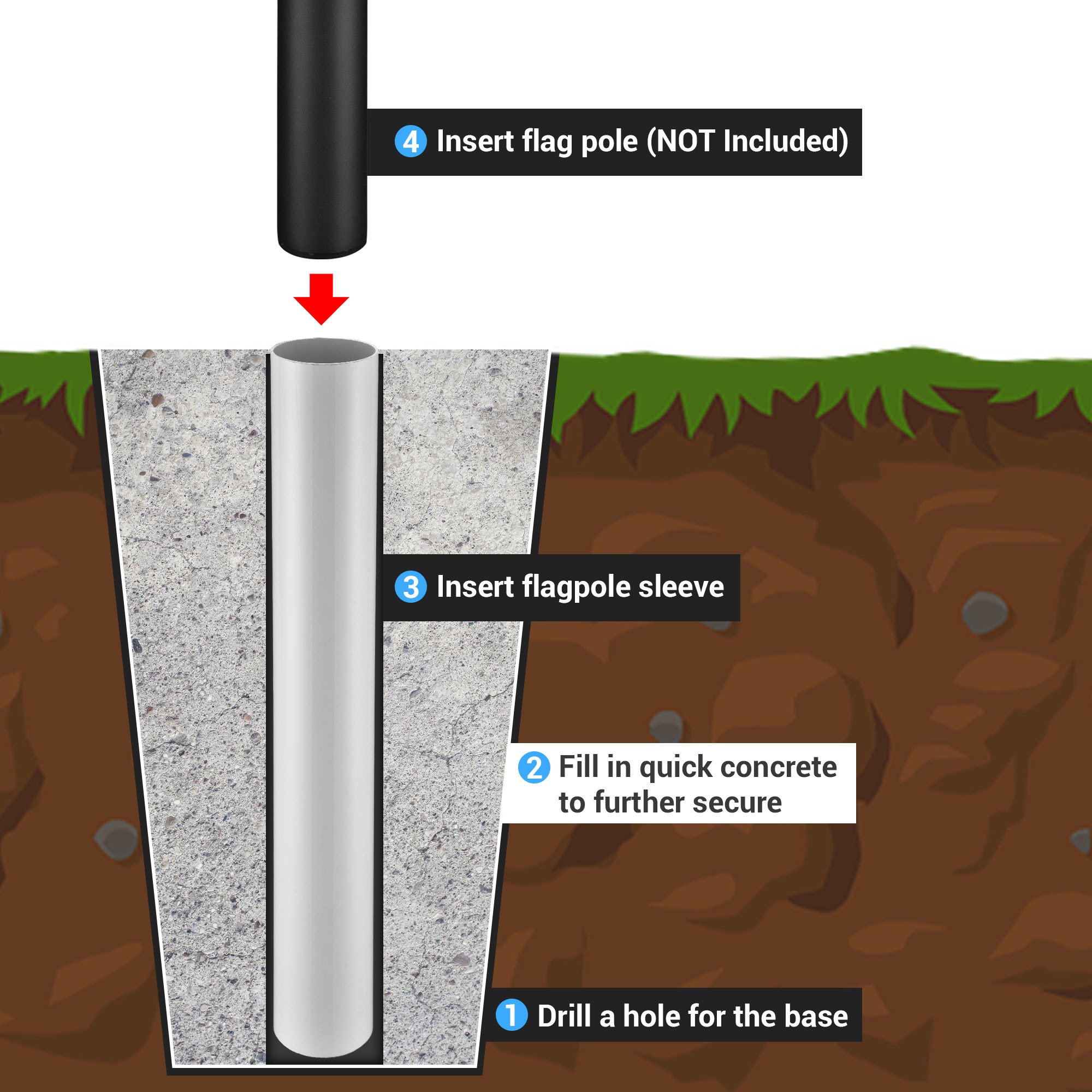 - Easy Installation - 3-step quick & easy setup: firstly dig a hole for the base; insert sleeve and flag pole; and finally fill in the hole with sand or concrete for further securing