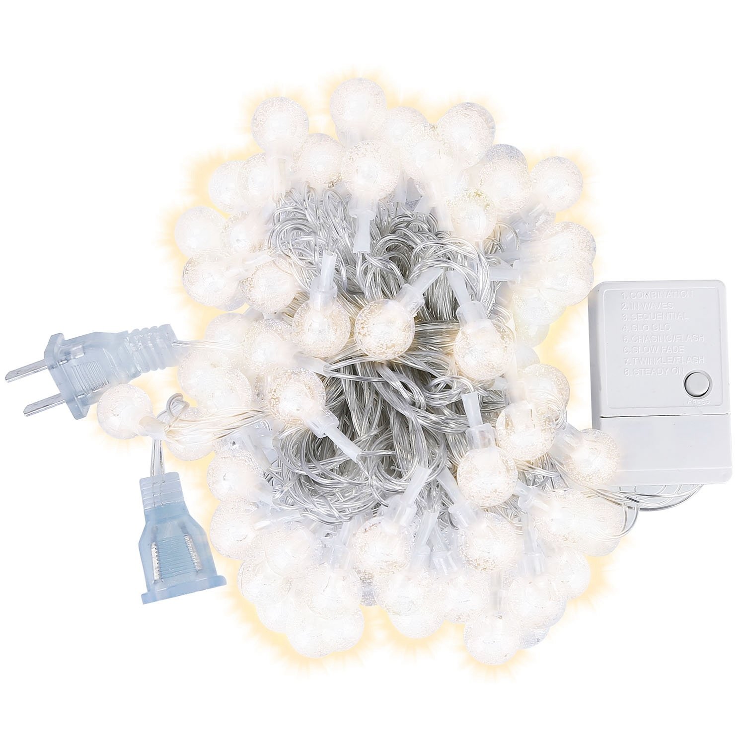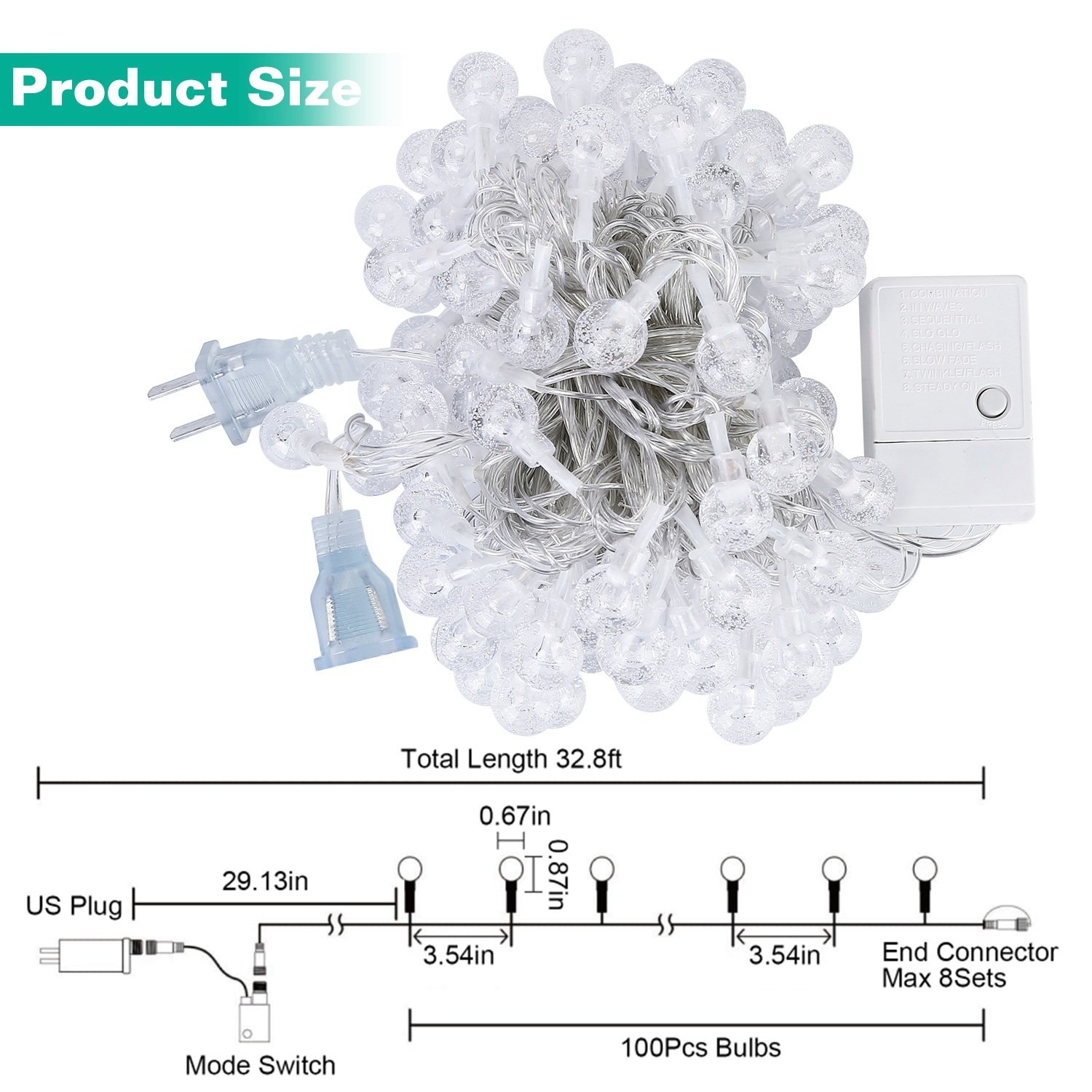 *8 Modes String Lights*:100 Globe bulbs dotted in a 32.8ft wire design; offering 8 lighting modes for you; including Combination; In wave; Sequential; Slo glo; Chasing/Flash; Slow fade; Twinkle/Flash and Steady on. Choose different lighting modes as you need in various parties.