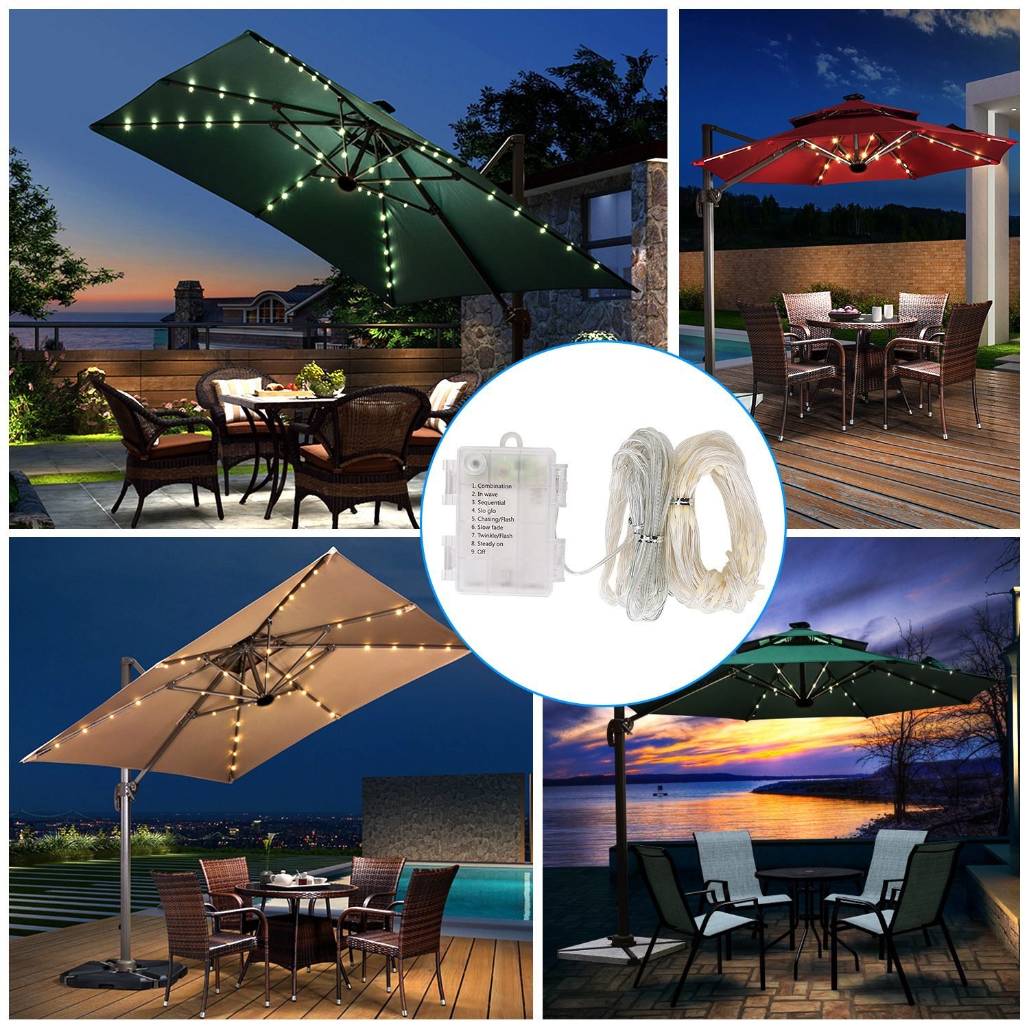 *8 Brightness Modes*:Gorgeous lighting modes including combination,wave,sequential,fading slowly,slow-glow,chasing,twinkle and steady on. Suitable for decorating umbrella or tents with 8 ribs. Ideal for decorating your patio,garden,deck,backyard,pool,gate,yard,party etc,also can be used as decorative string lights for cafe,bar,Christmas tree and other places.(Note:Umbrella not included)