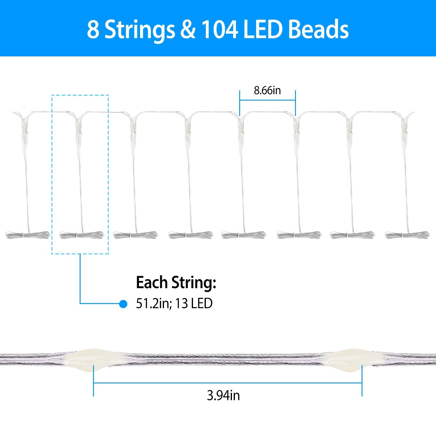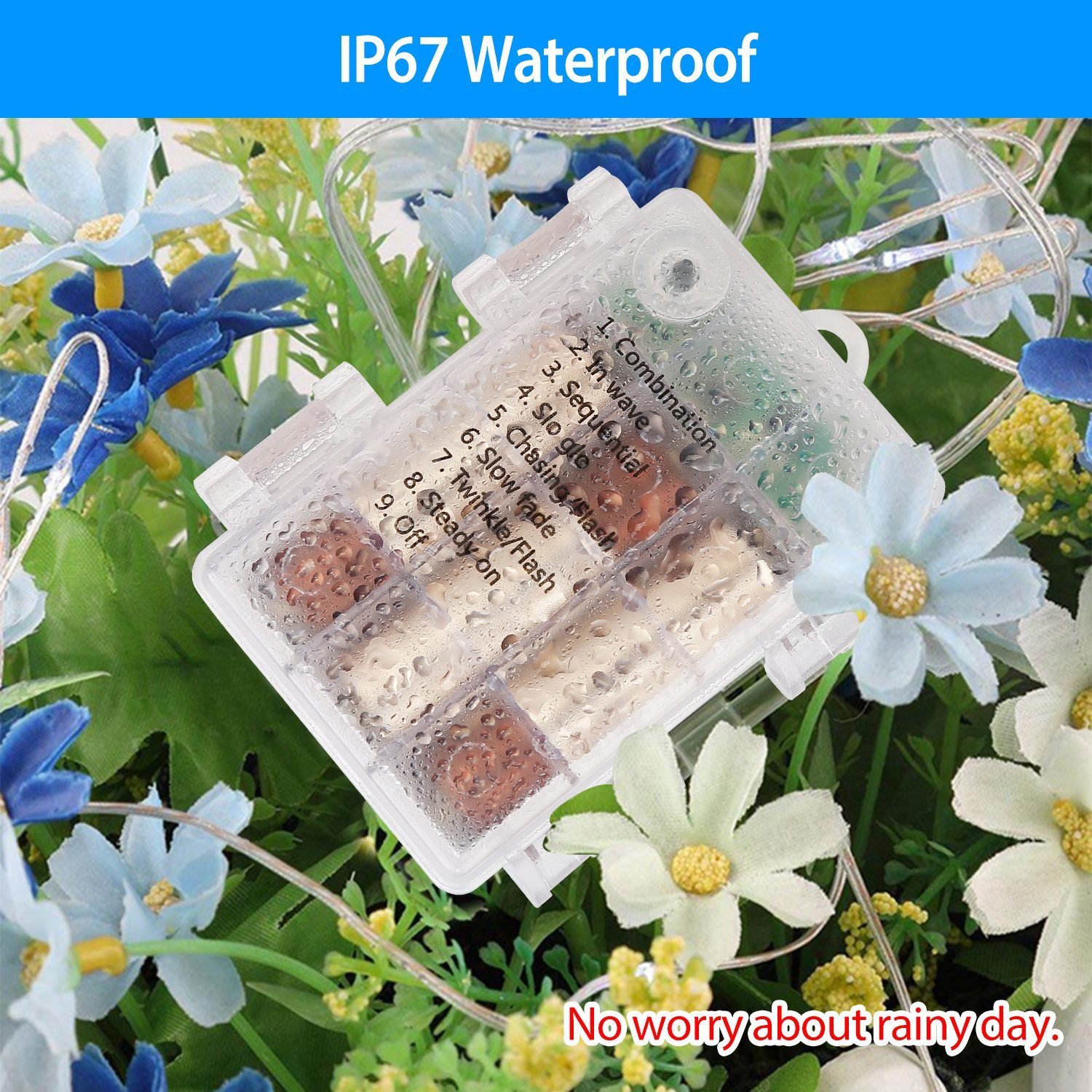 *IP65 Waterproof*:104 LED lights and 8 strings,13 LED lights per string. Each string,designed with super soft copper wire,can be moderately bent to any shape,having a long service time. The waterproof level of the battery box reaches IP67. It is protected from water and dust,suitable for varieties of weather.