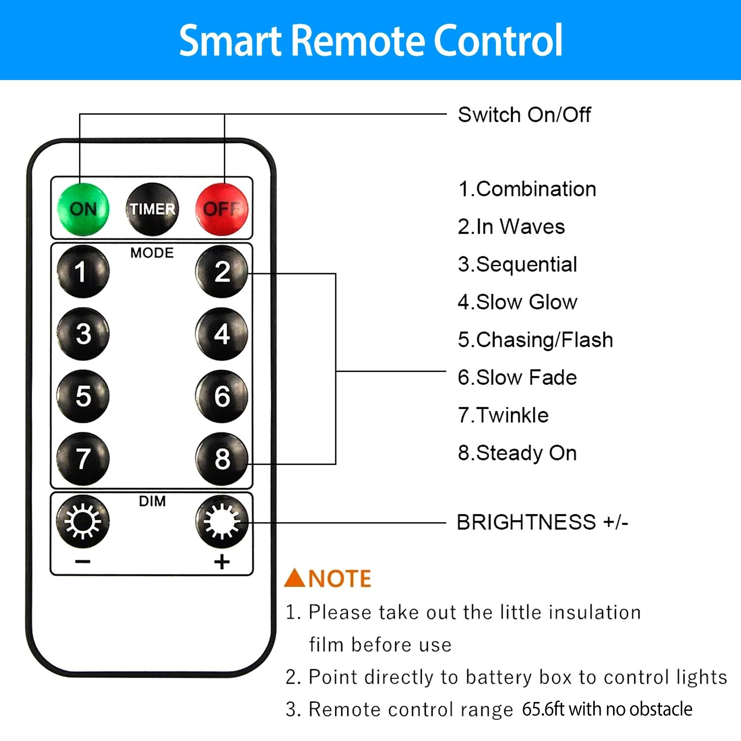 *Battery Powered & Remote Control*:Requires 3*AA batteries(NOT INCLUDED). The remote controller can be used to set work time,choose lighting mode,adjust light brightness,turn on/off,which is very convenient. And 1 to 8 number mean 8 lighting modes,and the remote control distance is 16 feet.