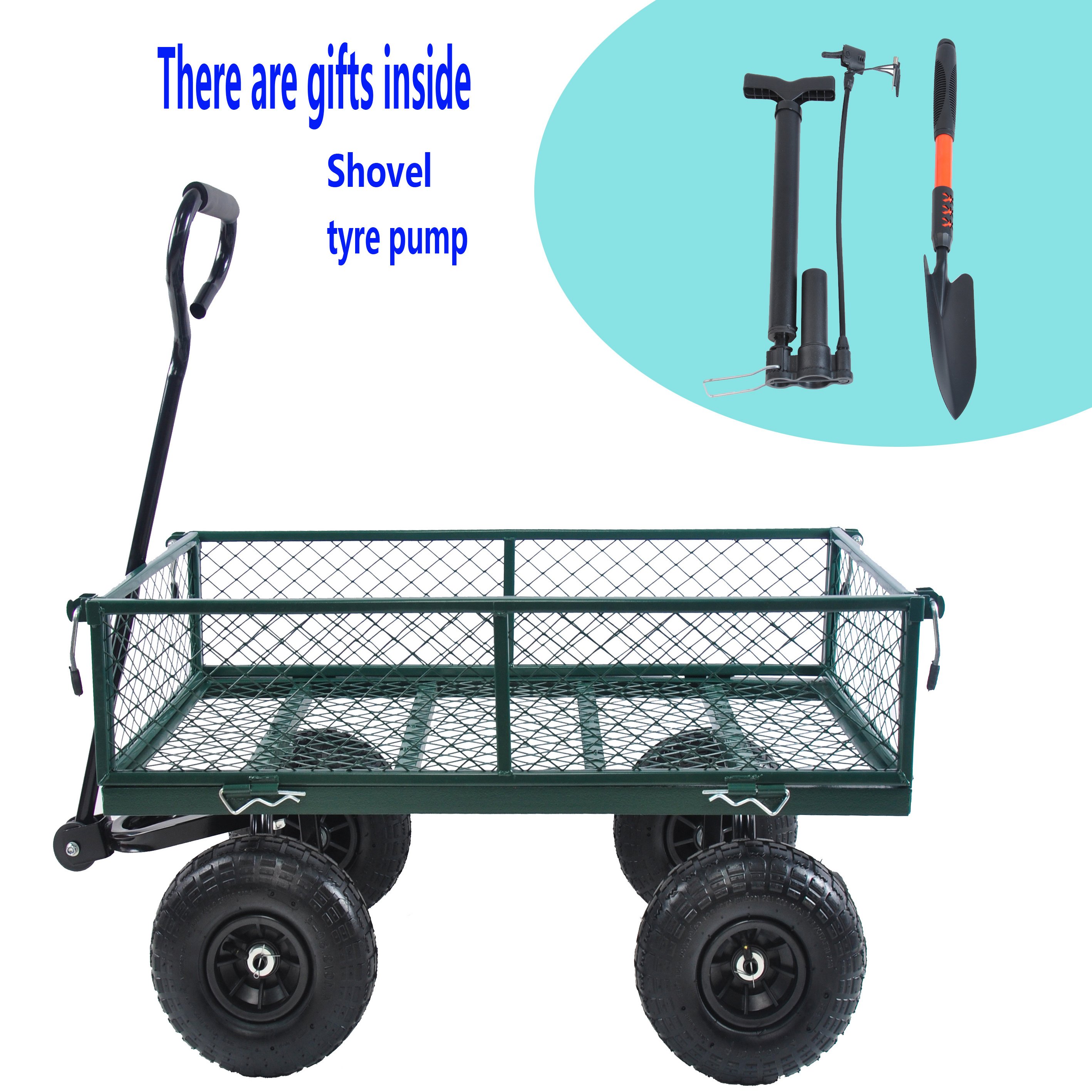 Wagon Garden trucks make it easier to transport firewood; plants; chicken feed; potted soil and honeycombs. The detachable side on the foldable utility wagon increases versatility when carrying larger loads. The practical garden trolley bears 550 pounds (about 249.5 kg); so it is strong enough to carry heavy work. You don't have to drag heavy materials to the original place on multiple trips. Heavy reinforced steel frame; 180-degree steering range handle control and 10-inch (about 25.4 cm) pneumatic tires make this garden utility vehicle stable and ready to help you complete tasks in the yard. Buy quickly! ! !