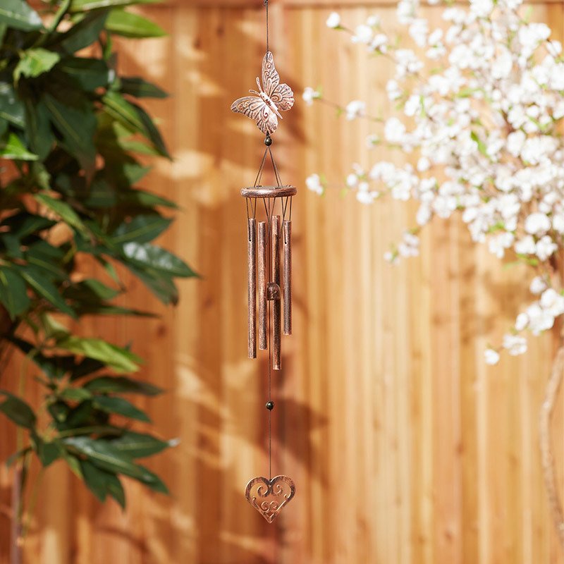 3.Charming wind chimes set features a pretty butterfly on top and a decorative heart charm below.