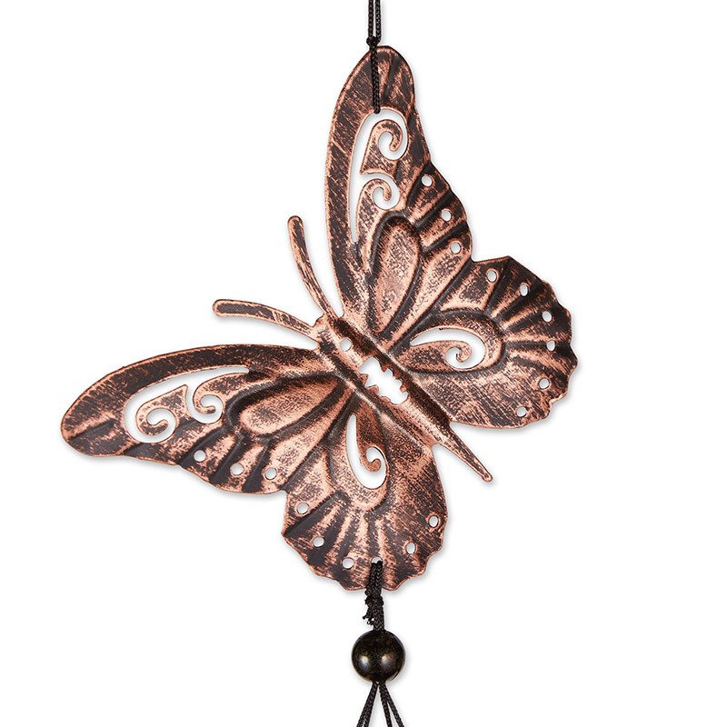 5.This beautiful metal wind chime features a singular butterfly cutout on top, with long chimes below along with small bells. Each of the smaller butterflies below twirls in the breeze.