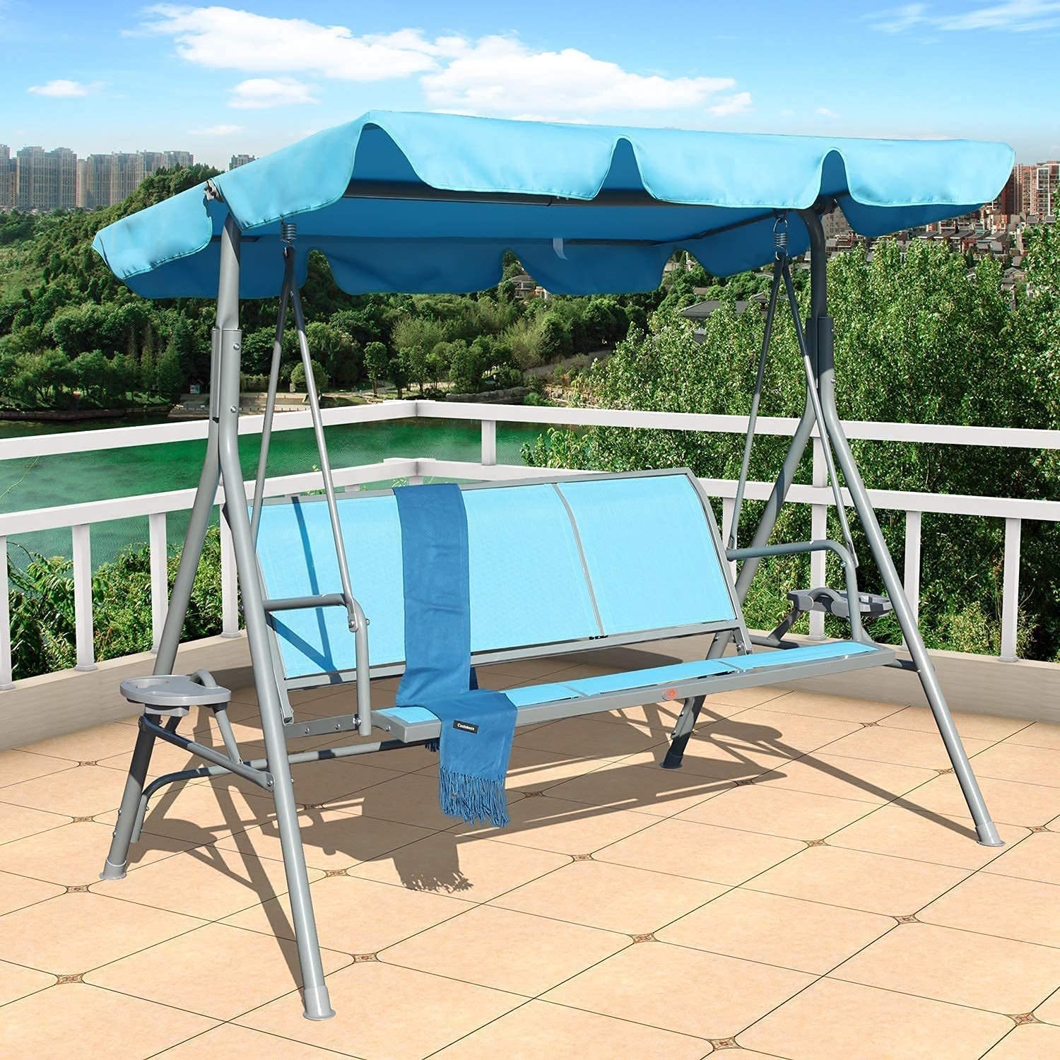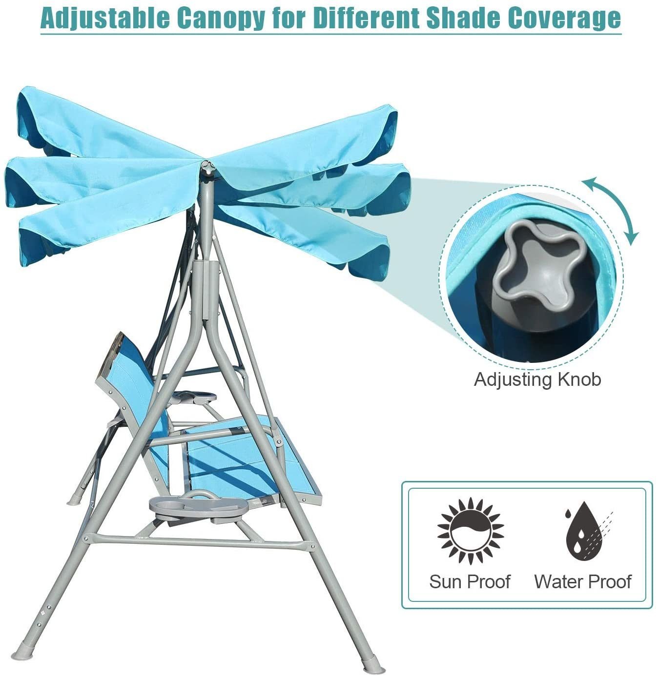Durable Metal frame supports up to 550 lbs. The Stable triangular base is designed with unique Style Heavy Springs connect the chair to the frame, ensuring a smooth, gentle rocking motion. Perfect for porch, patio, garden, balcony and poolsideThe adjustable canopy can be set at Various angles to provide optimal shade and protection from the sun's harmful UV rays against the rain and dust,Upgraded with 2 Utility Tray, Suitable for holding drinks and food during your leisure timeEasy to assemble and clean.Overall Dimension:67.5"(W)x 44"(D) x 59"(H)