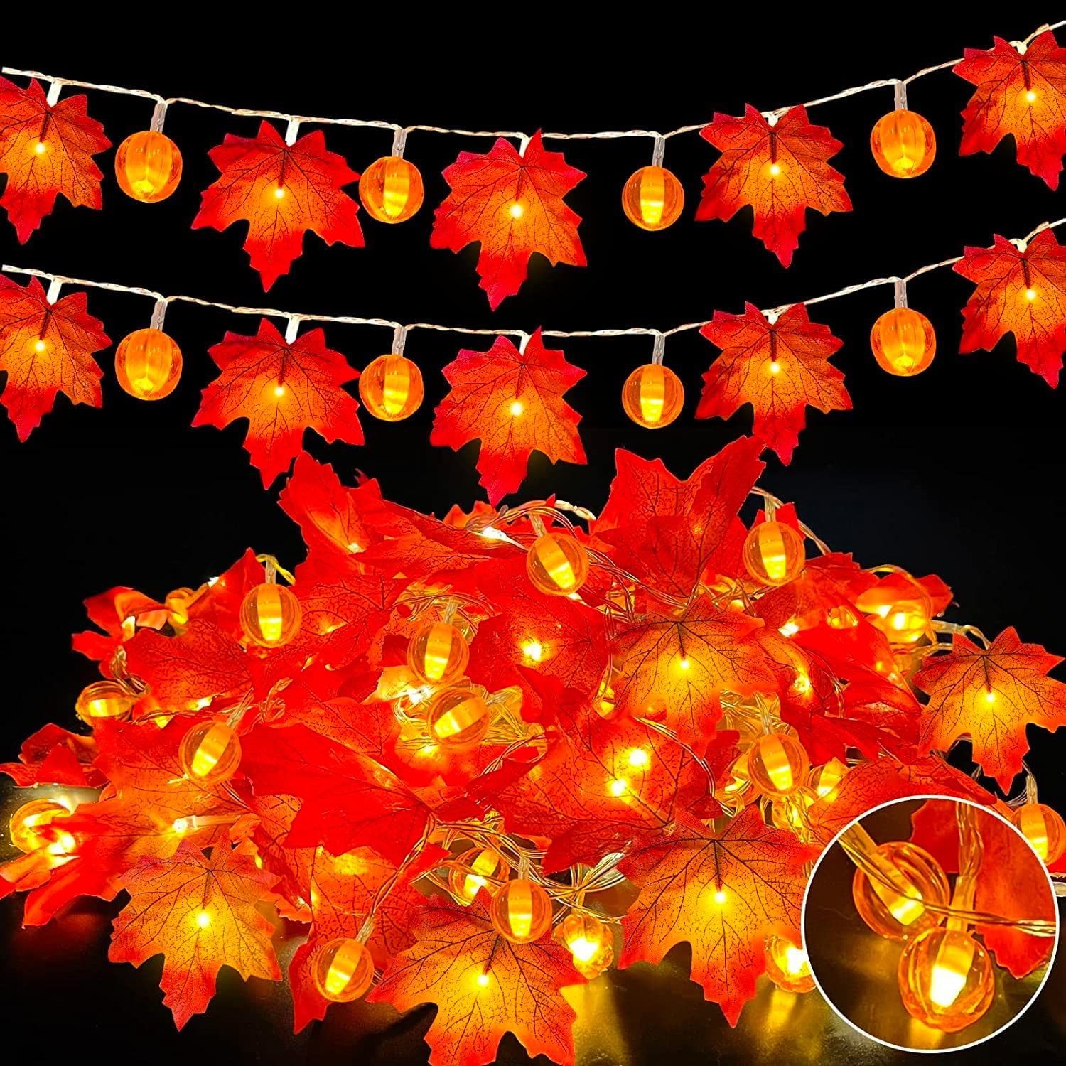 [ Enlarged Maple Leaves]The natural looking maple leaves are enlarged to 4 inch large size. Each Fall lights decor come with 10 pumpkin bulbs and 10 maple leaves lights, creating a sense of layer.The pumpkin lights size is 1*0.6 inch.