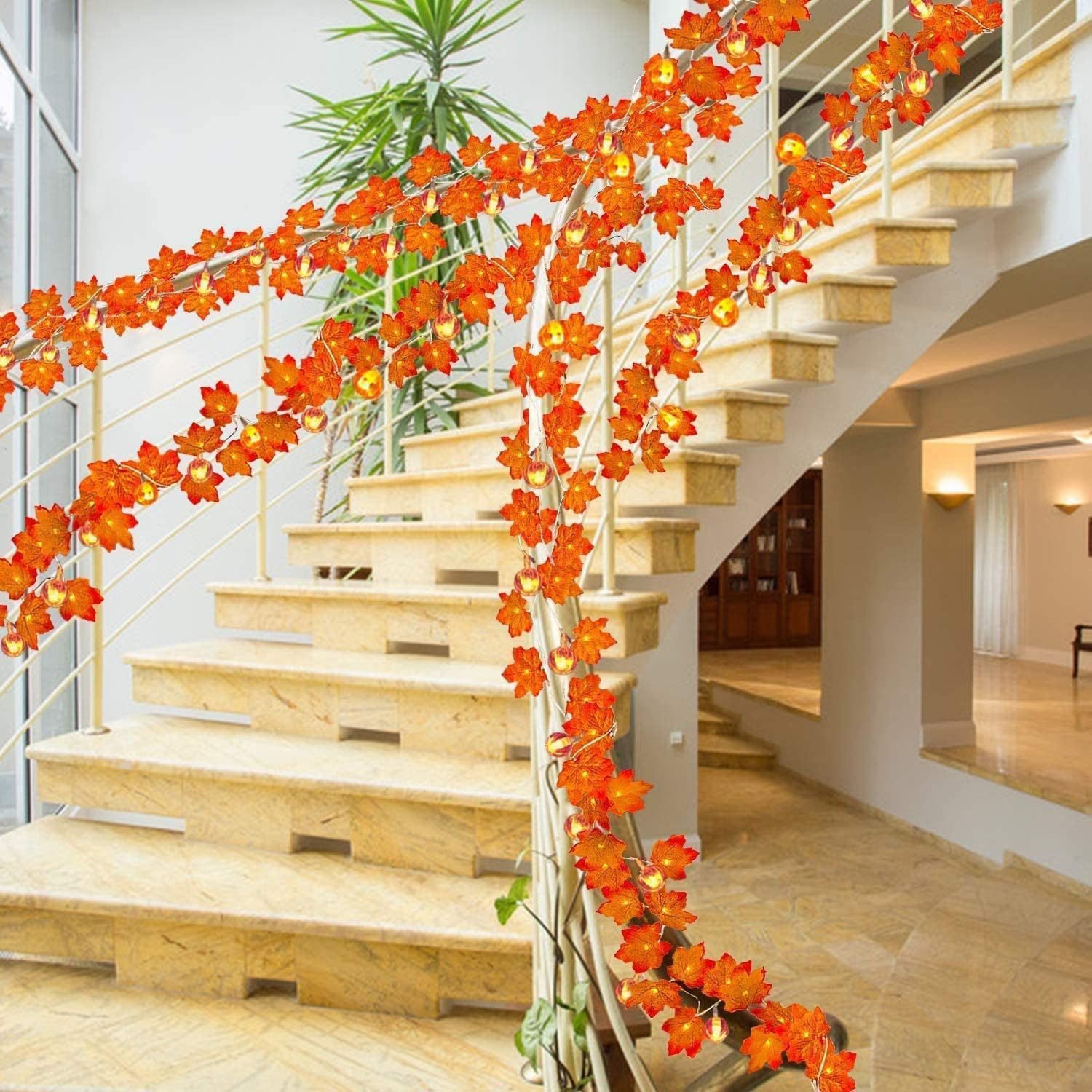 [ 3 Pack Fall garland with Lights ] Each fall lights is 12 inch long with 20 pumpkins lights, total 3 pack 36inch 60 lights. The length between lights is 5.5 inch. The fall string lights glow warm white lights at night.